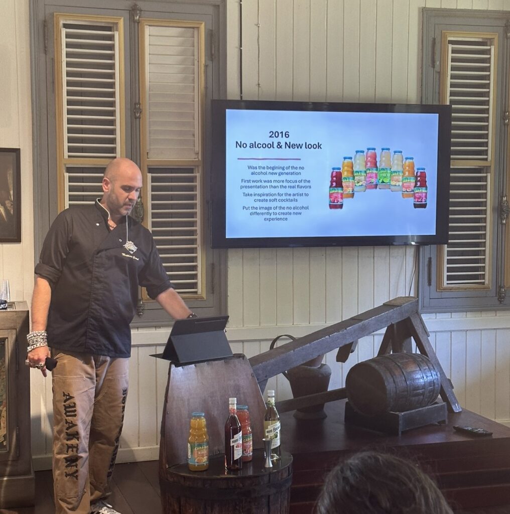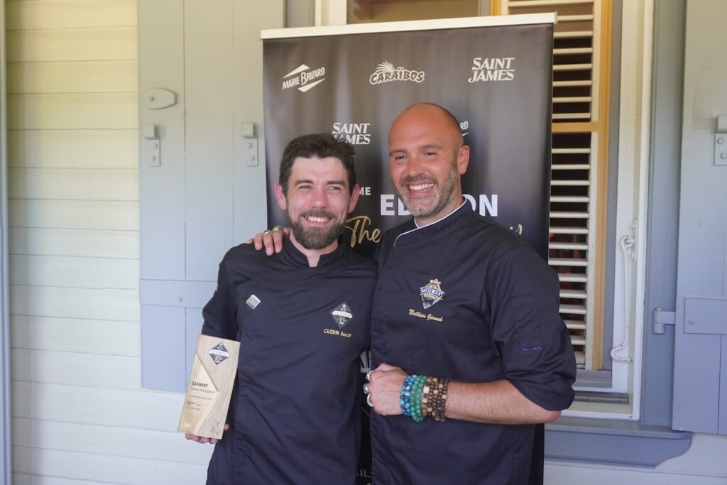 Le mardi 1er juillet, la journée a débuté par une immersion au cœur du patrimoine martiniquais avec la visite de la distillerie Saint James, véritable temple du rhum agricole. Un moment fort, chargé d’histoire et de passion, qui a immédiatement plongé les candidats dans l’univers riche et authentique de la Martinique. À l’issue de la visite, Matthias Giroud, président du jury, a animé une masterclass dédiée au sans alcool, partageant sa vision, ses techniques et son expertise sur ce segment en pleine évolution. Une séquence inspirante qui a permis aux finalistes d’affiner leur approche pour l’épreuve à venir. C’est dans ce cadre unique de la distillerie que la finale a ensuite eu lieu. Les finalistes ont eu une heure pour créer un cocktail sans alcool à partir des ingrédients locaux découverts la veille. À l’issue de ce temps, ils sont montés sur scène pour présenter leurs deux créations au jury : leur cocktail signature alcoolisé, celui qui leur avait permis d’accéder à cette ultime étape, ainsi que leur création sans alcool, imaginée sur place.