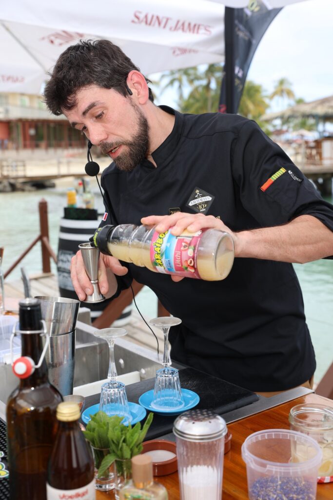Jonathan, représentant de l’Espagne, a séduit le jury par sa créativité audacieuse et son sens de l’équilibre aromatique. Son cocktail avec alcool, « Brith », associait le rhum Saint James 55° et la liqueur de fleur de sureau Marie Brizard, relevés par un cordial au miel d’eucalyptus et piment poblano, le tout sublimé d’une touche de champagne. Une création sophistiquée, entre fraîcheur florale, douceur miellée et intensité épicée. Pour l’épreuve sans alcool, il a présenté « Cinturón de fuego », un mocktail à base de grenadine infusée à la fleur du paradis, de jus de passion Caraïbos et de gingembre frais, le tout équilibré par quelques gouttes de solution saline. Un mélange original et vibrant, fidèle à son univers.